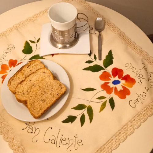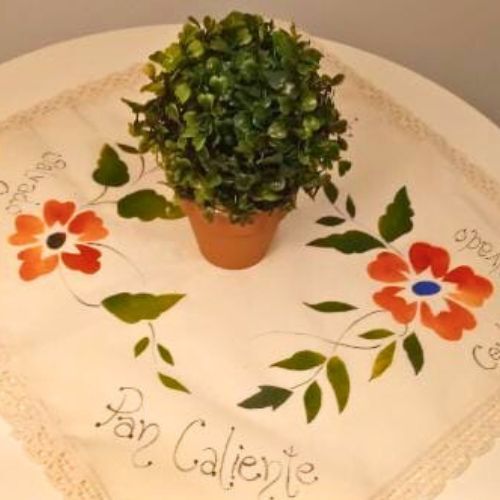 Carpeta o individual de liencillo, para un rico desayuno Natural. Colores cálidos alegran cada mañana.  Con puntilla de algodón de color natural. Multiuso