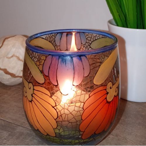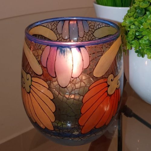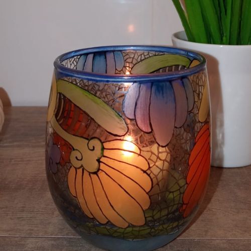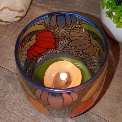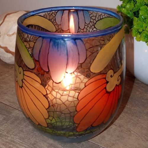Fanal en Vidrio, tipo bombé, con técnicas mixtas de plumín , barridos. etc. dónde atreves de la luz de la vela se aprecia su hermoso y Único diseño, el cual es muy elaborado.
