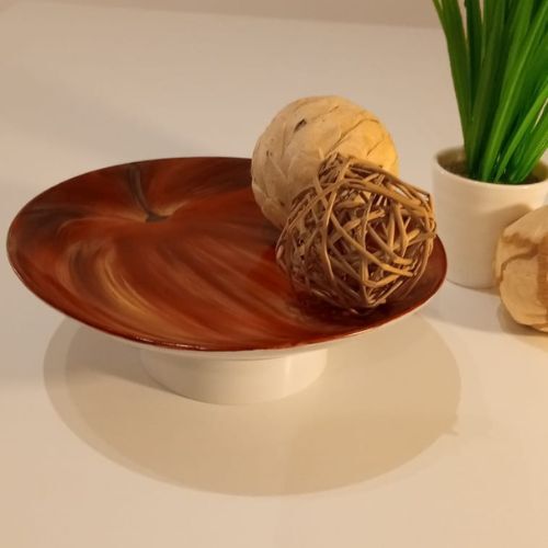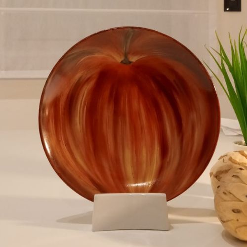 También se puede colgar o exhibir en atril. Se le puede agregar base para convertirlo, en pieza utilitaria, como centro de mesa o bien para servir unos ricos cuadraditos de manzana y canela, especial para acompañar el café.