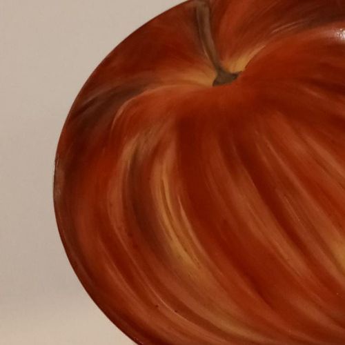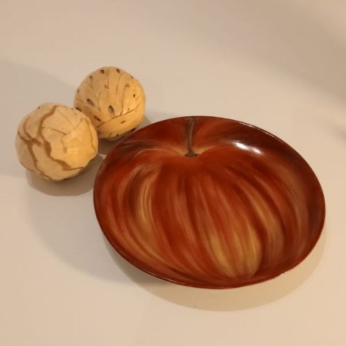Plato en porcelana, en toda su superficie pintada una manzana roja.