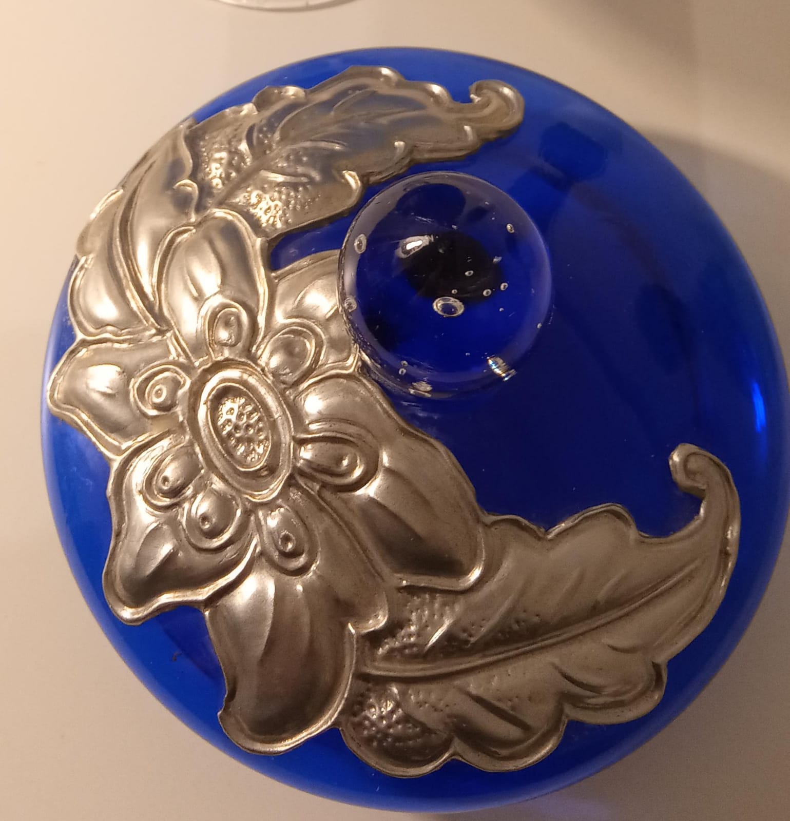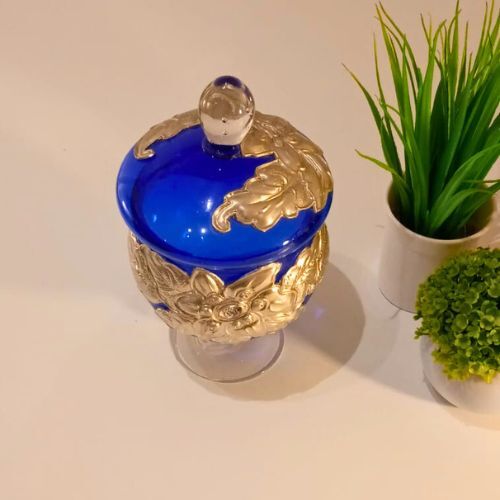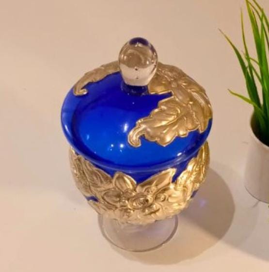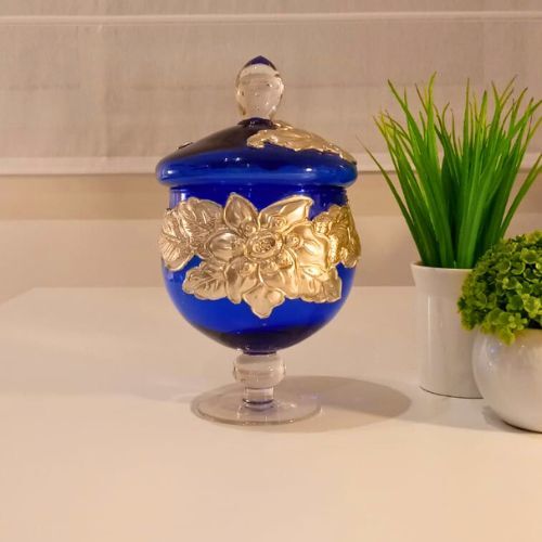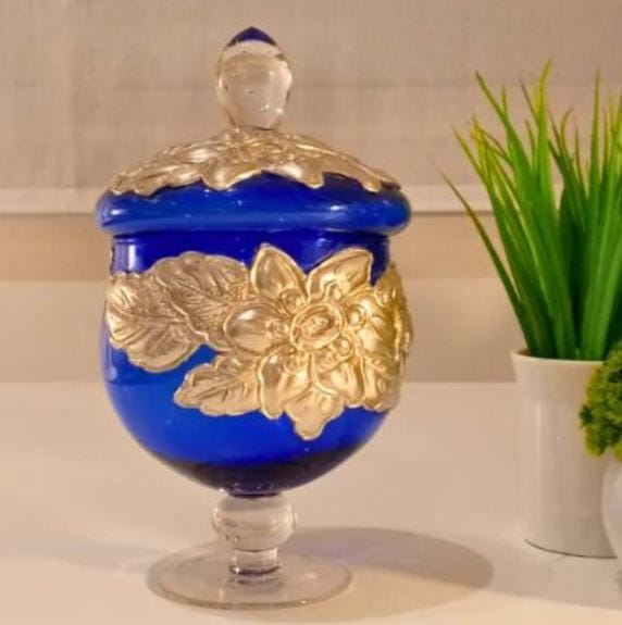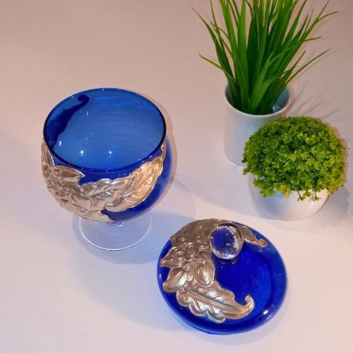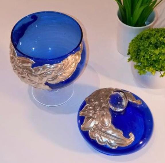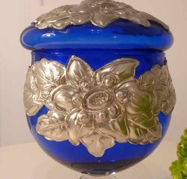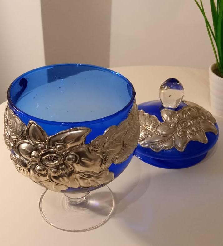 Potich en vidrio Azul combinado con detalles en vidrio transparente. Posee aplicaciones de diseños en Estaño grueso de origen Francés, el mismo está repujado a mano. Con tapa desmontable.