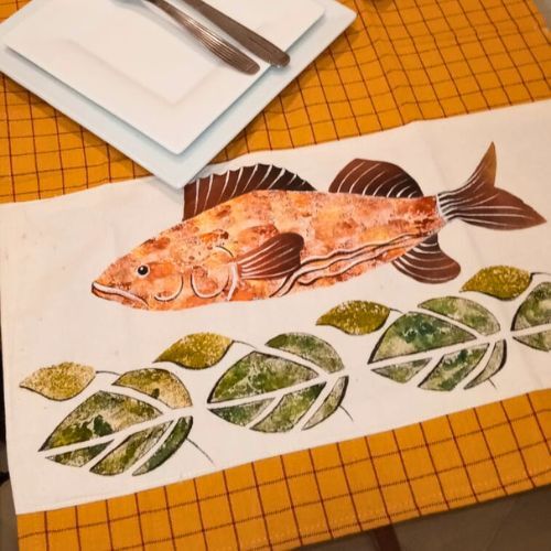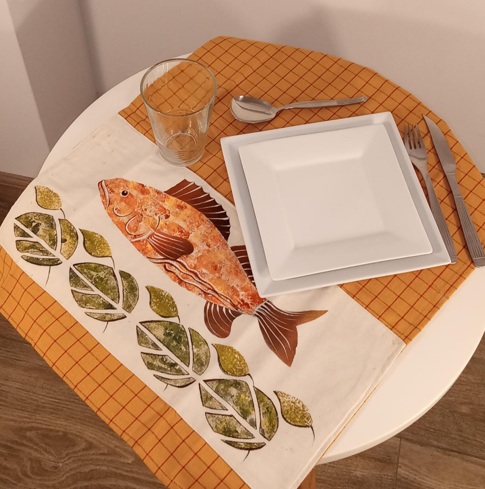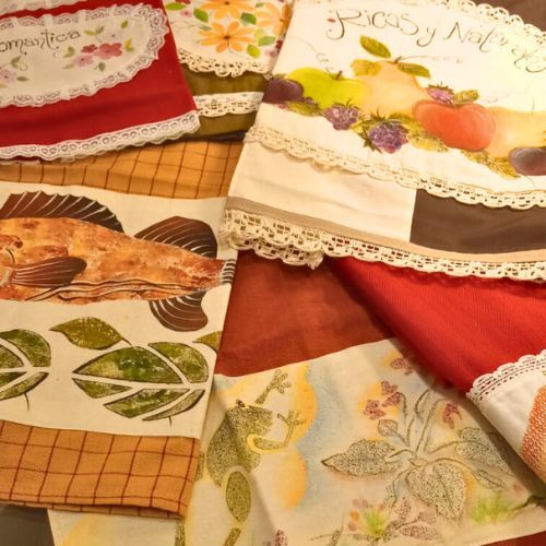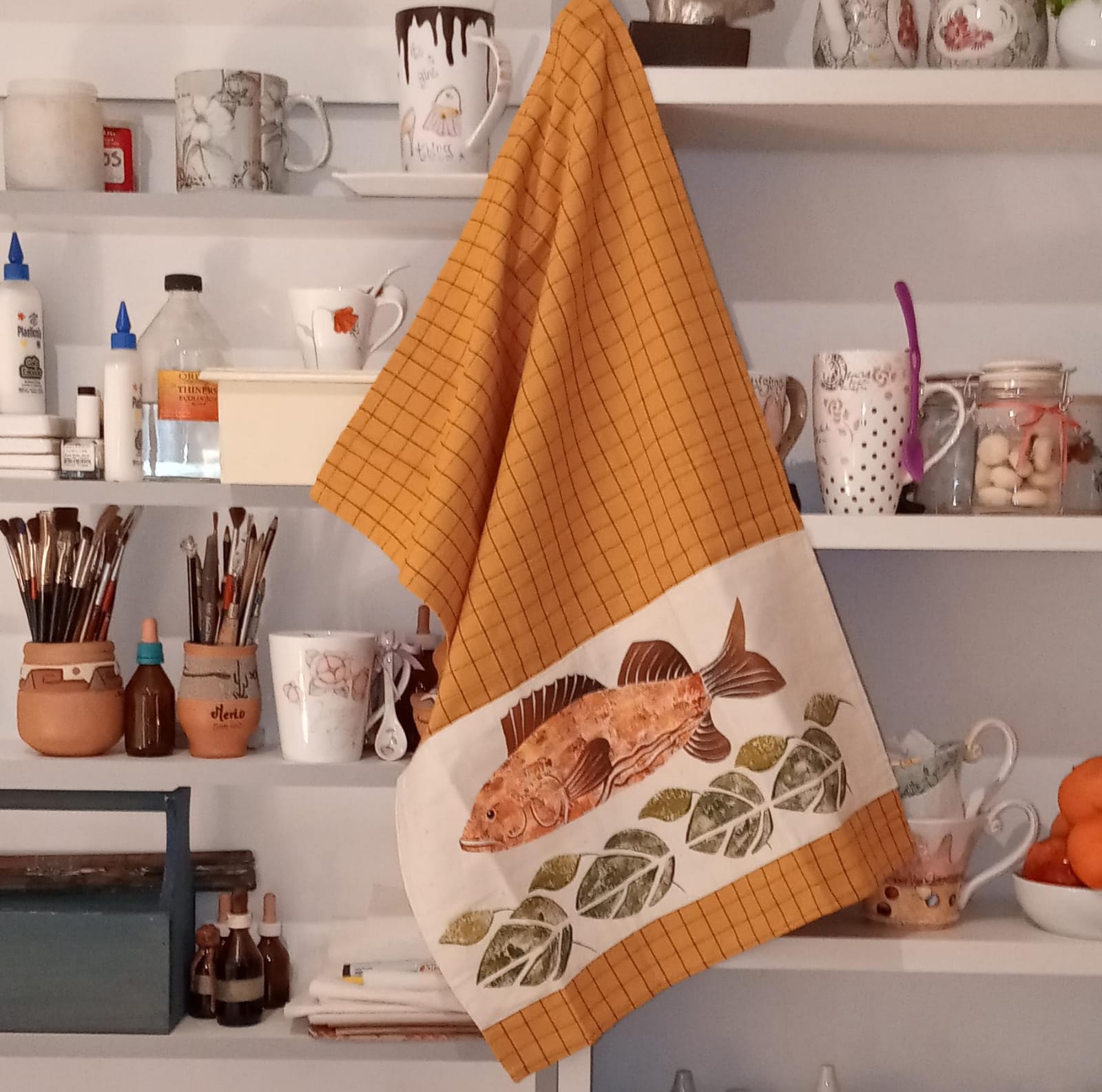 Aplique de diseño de pintura sobre liencillo, con alegres colores, que dan a tu cocina mucha alegría! Realizado totalmente a mano.