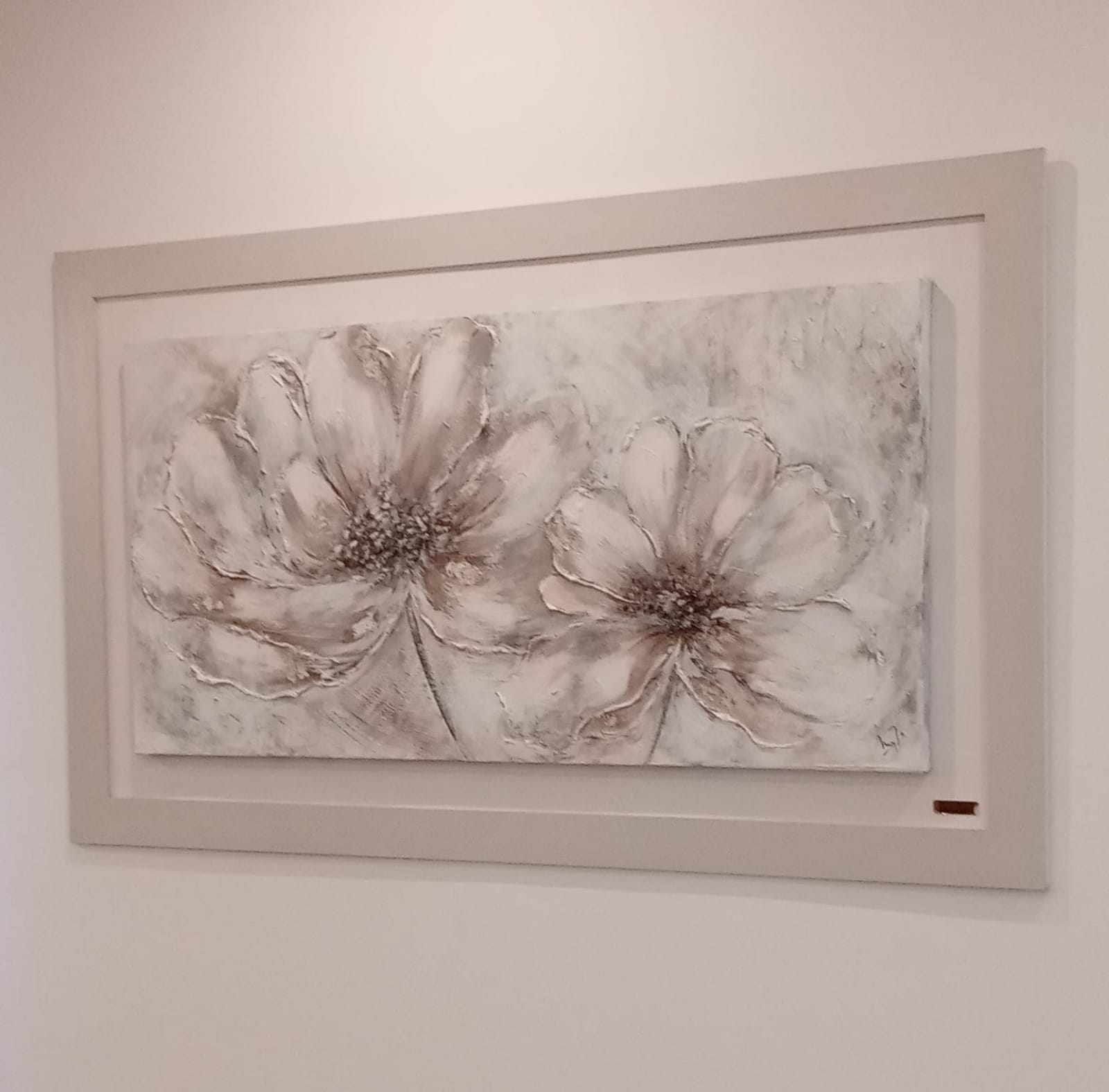 Tela con bastidor, amurada sobre fondo de madera pintada en blanco y marco de color.